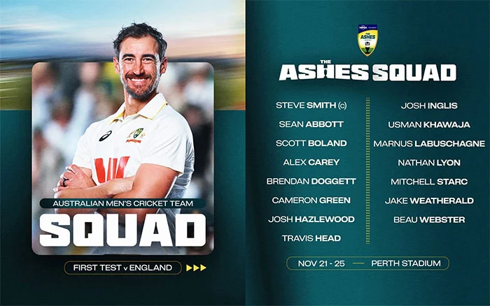 آسٹریلیا کرکٹ بورڈ نے پہلے ایشیز ٹیسٹ میچ کے لیے 15 رکنی اسکواڈ کا باضابطہ اعلان کر دیا ہے۔ تفصیلات کے مطابق کپتان پیٹ کمنز کی عدم دستیابی کے باعث ٹیم کی قیادت اسٹیو اسمتھ کریں گے۔ پیٹ کمنز اپنی چوٹ سے مکمل طور پر صحت یاب نہ ہونے کی وجہ سے پہلے ٹیسٹ میچ میں شرکت نہیں کر سکیں گے۔ آسٹریلیا اور انگلینڈ کے درمیان تاریخی ایشیز سیریز، جو پانچ ٹیسٹ میچوں پر مشتمل ہوگی، 21 نومبر سے پرتھ میں شروع ہوگی۔